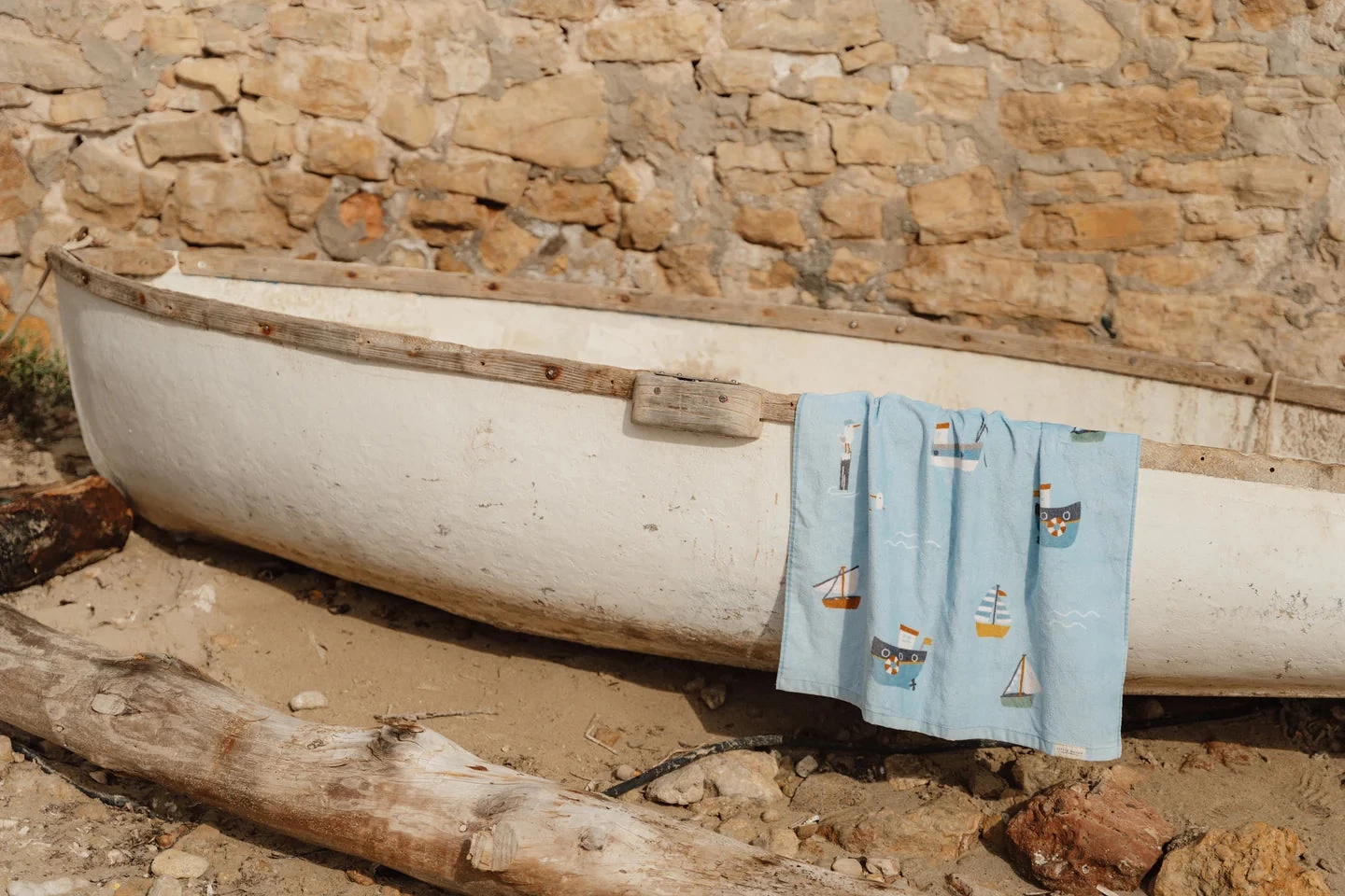 Wrap to dry! After splashing around the water this bath towel awaits to dry you off and give you warmth and comfort. The fun Sailors Bay design will make you enjoy the comfort of the towel even more. At the beach or at home, this bath towel is an absolute necessity after a dip in the water. The colourful print and high quality fabric of 100 % cotton, will feel like a soft hug enchanted with the adventures of the sailboats at sea. Matching the towel with Sailors Bay beachwear or inflatables make the towel and your little one even more cute.