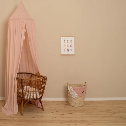 Create a cosy sleeping or playing area with this beautiful canopy. Suspending it from the ceiling will add a beautiful touch of ambiance to a nursery. The canopy gives a protected and comfortable feeling to your baby and ensures nights filled with lovely dreams. Place the canopy above a soft play mat or rug and it turns into a magical play tent. It will look stunning in a children’s room and your little one will love the cosy corner to play or read. The light fabric is mounted on a hoop and has a strap on top for easy fixing. The two small tassels give a little extra detail, but you can also decorate the canopy with a dream catcher, mobile or a something homemade such as a garland. Make sure the canopy is suspended safely and consider the development of your baby regularly to avoid your child being caught up in the material.
