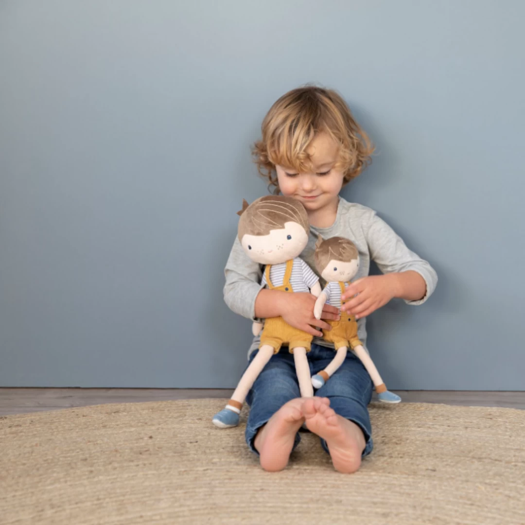 Jim the cute plush cuddle doll in their cool dungarees is soft and lovely to cuddle with. They can sit up and likes to go with you in the Little Dutch wooden doll stroller.