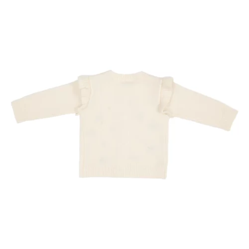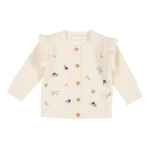 It’s like walking through a field full of flowers! This knitted cardigan has embroidered flowers on the front. Adorable! The ruffles make the cardigan look even cuter. The item in the colour soft white has a round neck and buttons on the front. It is made with organic cotton.