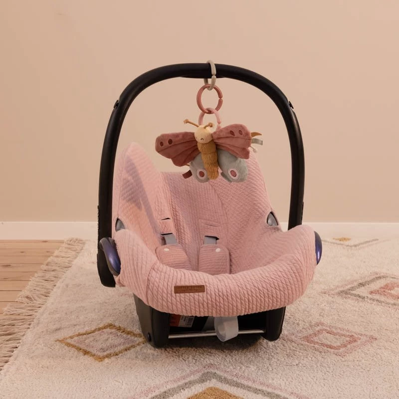 A new butterfly friend. There is so much to see and discover with this soft activity toy. From cute crackling wings to a rattling sound and from cotton buttons to colorful labels. This cheerful butterfly will certainly stimulate your child’s curiosity. Attach a dummy or our little loops.Â