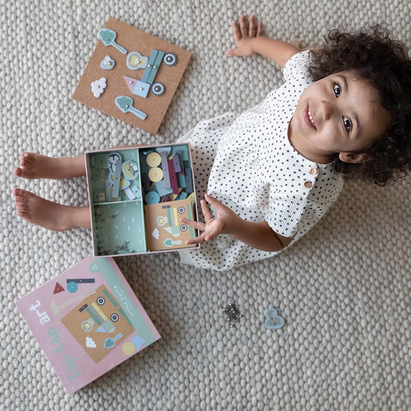With this hammer-tapping game from Little Dutch, children from 3 years old can happily work on it. The set contains a combination of wooden geometric shapes and illustrated figures of high-quality cardboard. Children can let their imaginations run wild and create the most beautiful fantasy scenes. The game consists of a cork base, a wooden hammer, various figures of wood and cardboard, 4 examples and 70 nails.