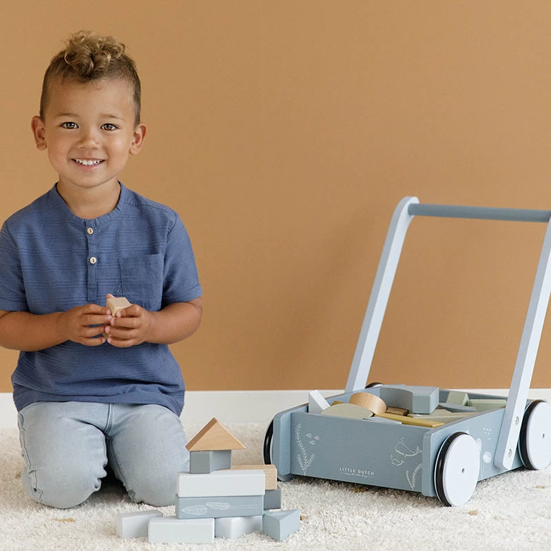 The handle is at the right height for toddlers so that they can comfortably walk around the room. This cheerful cart full of blocks guarantees hours of building fun.