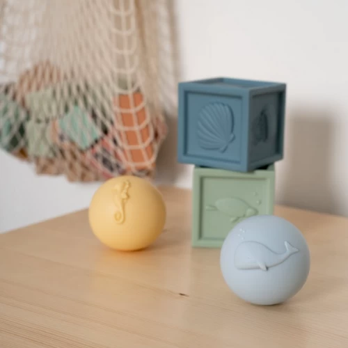 These cubes and balls with marine animals help to stimulate the fine motor skills of your baby. They are made of PVC which makes it comfortable for your baby to chew and bite on. The cute and colourful design with different textures is fun to play with. Matches the Ocean collection.