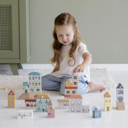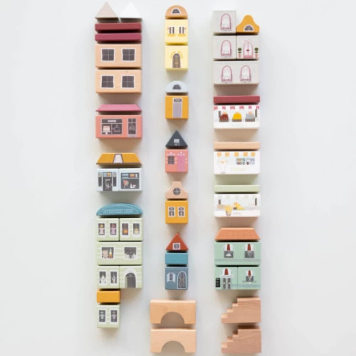This Little Dutch’s urban-style playset is perfect to be used together with the wooden railway set. It includes 50 blocks to create town buildings, like shops, a hotel and a restaurant. Children will enjoy combining the different building elements, which makes playing with these blocks so much fun. Complete the town with the railway train XXL set and additional extension sets for hours of fun play.