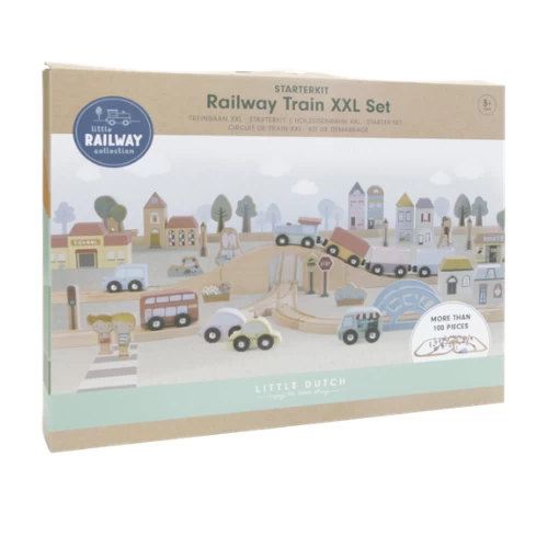 With this beautiful railway train XXL Set children go on endless adventures. Hop on board the train, the bus, the taxi or the car and explore the town. With more than 100 parts, this set offers many options to get creative and build new combinations over and over again. Each of the wooden figurines and elements has detailed illustrations on both sides. Additional playsets, such as vehicles, a zoo, a train station, a fire station, a city and a garage, are available for even more hours of fun play. Made of durable FSC certified wood.Â