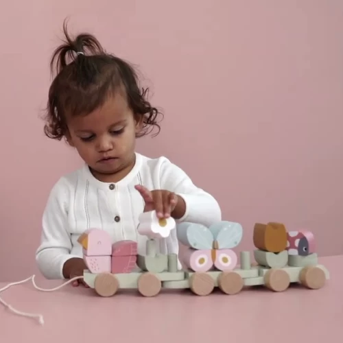 Let’s fly away by train! This wooden train is ready for a new adventure in the blooming garden. Little pink bird Olivia will show you around the most beautiful Flowers and Butterflies. Use your imagination to build the train using the stacking blocks in various shapes and dreamy colours. There are 3 carriages to stack with a bird, flowers, butterfly and ladybird. Challenge your little one to create different combinations to support hand-eye coordination and fine motor skills. It also makes a nice accessory for the nursery or playroom.