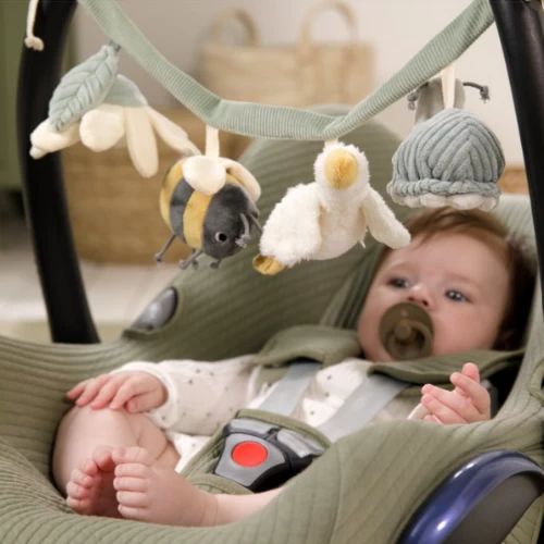 This stroller toy chain with Little Goose and his friends is easy to attach to a stroller or a car seat and provides lots of fun and entertainment on the road thanks to the rattle, the mirror and the squeaky and crinkly toys. It also stimulates the hand-eye coordination.
