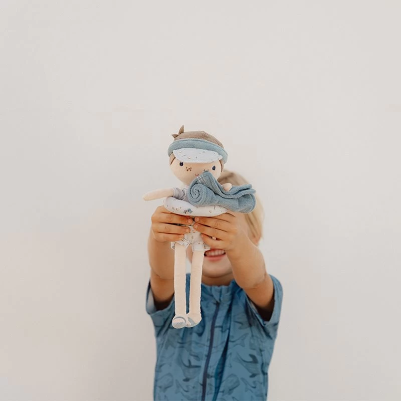 Meet cool Jim. He’s ready for a day of water fun! This plush cuddle doll in sandals, wearing his nautical swimsuit from the Sailors Bay collection, can’t wait to be cuddled. His summer outfit is completed with matching sun visor hat and the best essential for playing in the water; a swim ring. He is always in for building a sand castle, or playing with water and treasure hunting at the shore. Jim will be your new best friend. Whenever you would like to play or need a big hug, he is right there at your side. Bring his swim ring and towel to discover endless summer adventures together. Jim is soft and cuddly, 35 cm tall and comes in a beautiful storage box.