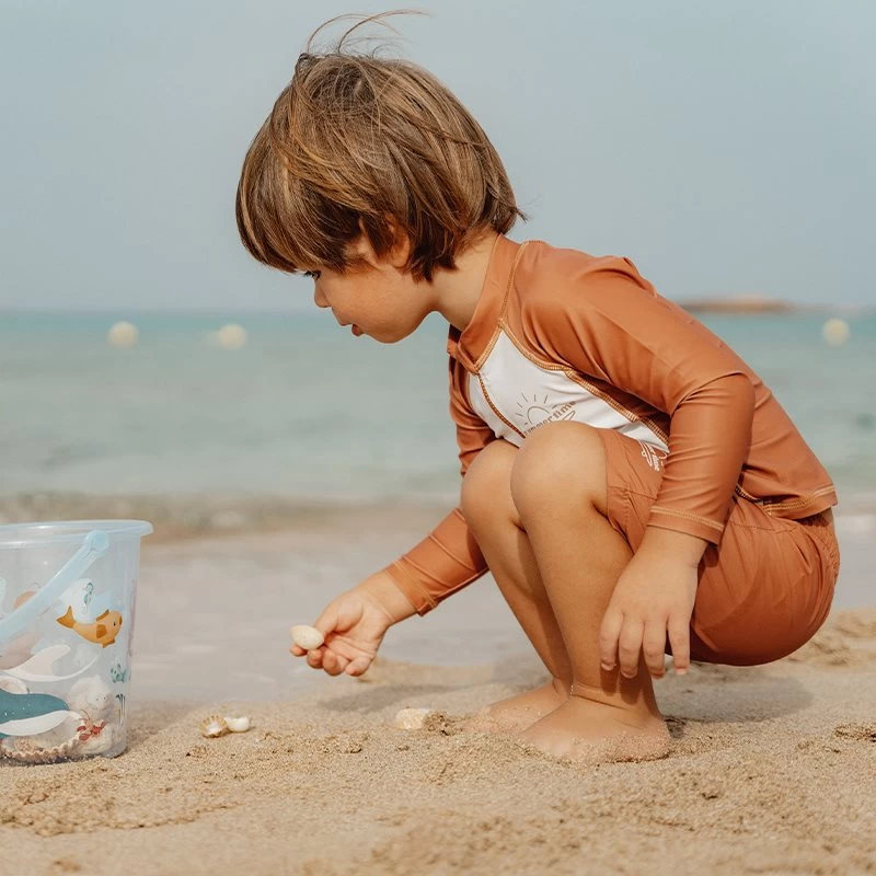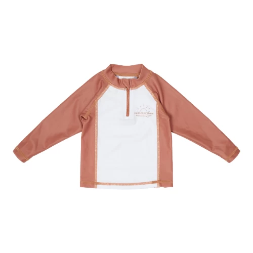 The sun is shining so let’s go! Grab your long sleeved rash guard and pack your beach favourites for a day of water fun. This swim shirt will keep you warm in the water and protect you from the sun while you play all day long. Whether you love to surf the water or float around in a swim ring, this shirt is the perfect choice for summer activities at the seashore. In a combination of brown and off-white and a touch of sunshine, this rash guard with long sleeves from the Vintage Sunny Stripes collection gives your little surfer a cool beach look as well as a comfortable fit. Thanks to the zipper on the front it’s easy to put on and take off. Even when your little one is wet and covered in sand. The rash guard is made from UV protective recycled polyester and is available in sizes 62/68, 74/80, 86/92 and 98/104. Pair with the matching swim short for a coordinated look. Don’t forget to always use sunscreen lotions to protect your little one