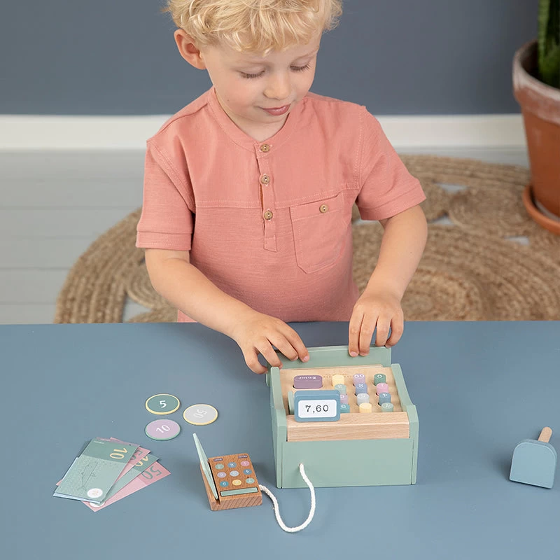 This well-designed wooden toy cash register is perfect for hours of enjoyable role play. The Little Dutch cash register includes a scanner, push button numbers, a cash drawer, toy money and a payment card option. Available in a lovely mint colour.